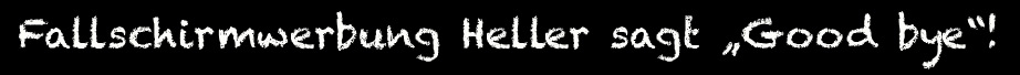 nach 35 erfolgreichen Jahren haben wir die Firma "Fallschirmwerbung Heller / FSW Heller" zum Jahresende 2014 aufgelöst. Es war eine sehr schöne Zeit, mit vielen interessanten Aufgaben, netten Kontakten und zufriedenen Stammkunden. An alle unsere langjährigen Geschäftspartner und Kunden ein herzliches Dankeschön! Ein Beitrag von Peter Schäfer zur Erinnerung: